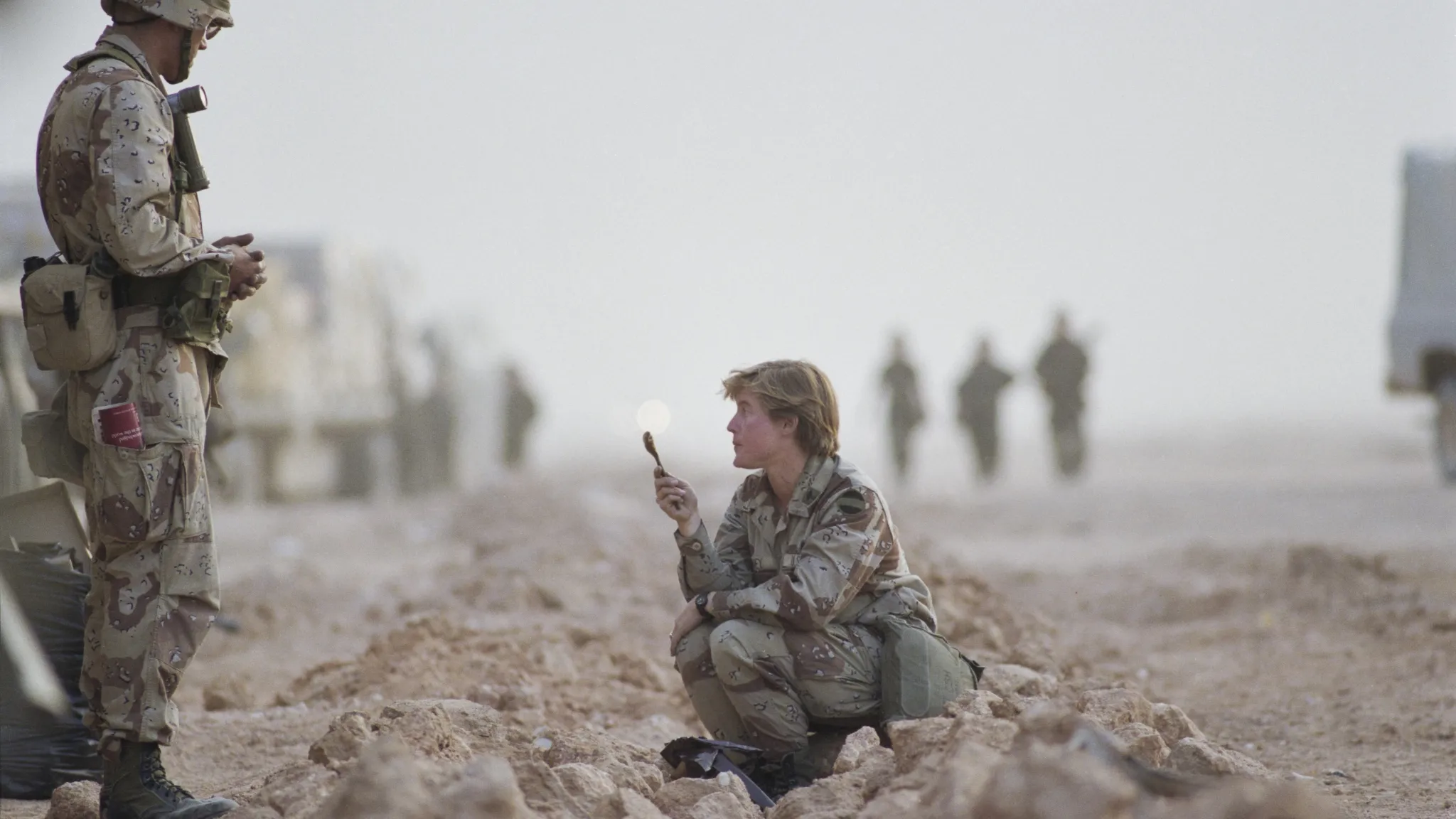 Soldiers in military fatigues in the desert, with figures visible in the background, in the Saudi–Iraqi neutral zone on the border between Saudi Arabia and the Iraq, 1991. (Photo by David Turnley/Corbis/VCG via Getty Images)