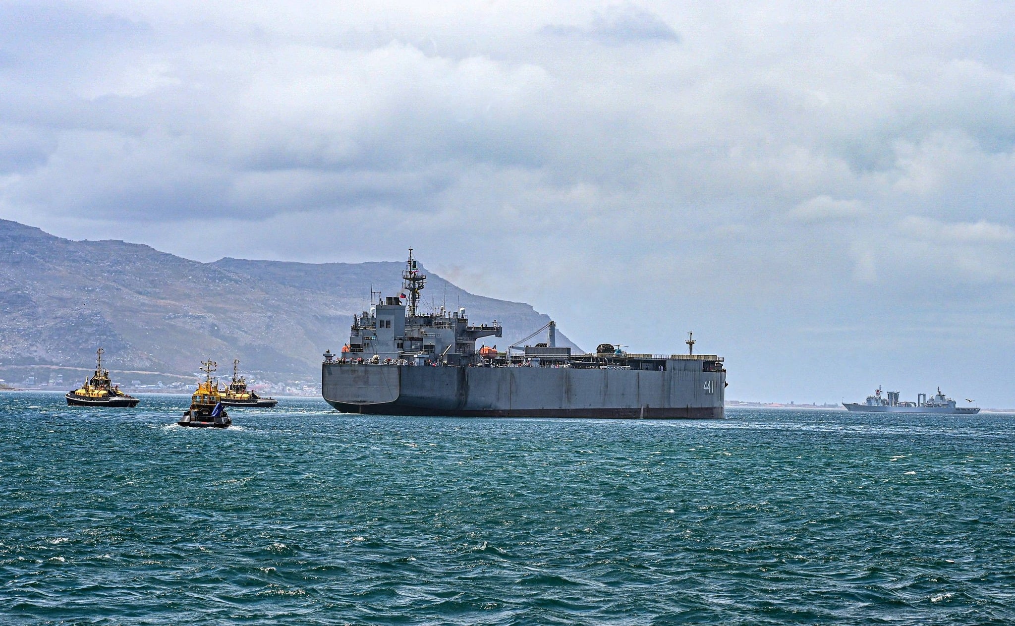 Iranian Navy expeditionary sea base IRIS Makran (441) arrived Jan. 8, 2026, in Simon’s Town, South Africa for “Will For Peace 2026” drills. South Africa National Defense Force photo